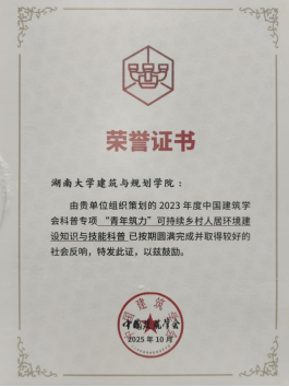 近日,2024-2025年度中国建筑学会科普教育基地工作交流会在江西景德镇举行。会议全面总结了中国建筑学会近两年科普工作成果与未来发展计划。会上,由我院组织策划的“青年筑力”可持续乡村人居环境建设知识与技能科普项目受到表彰,这是中国建筑学会对我院在建筑科普领域工作成绩的高度肯定。